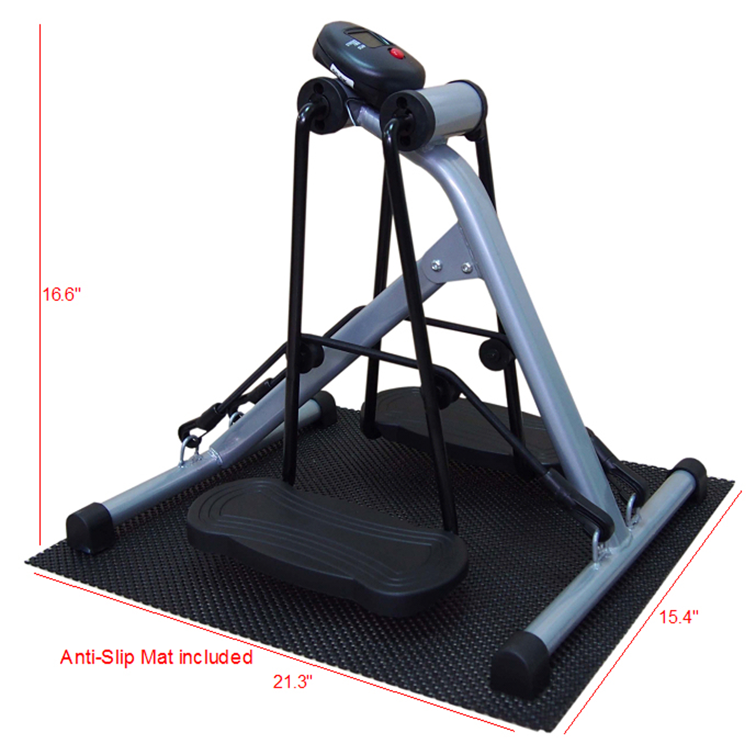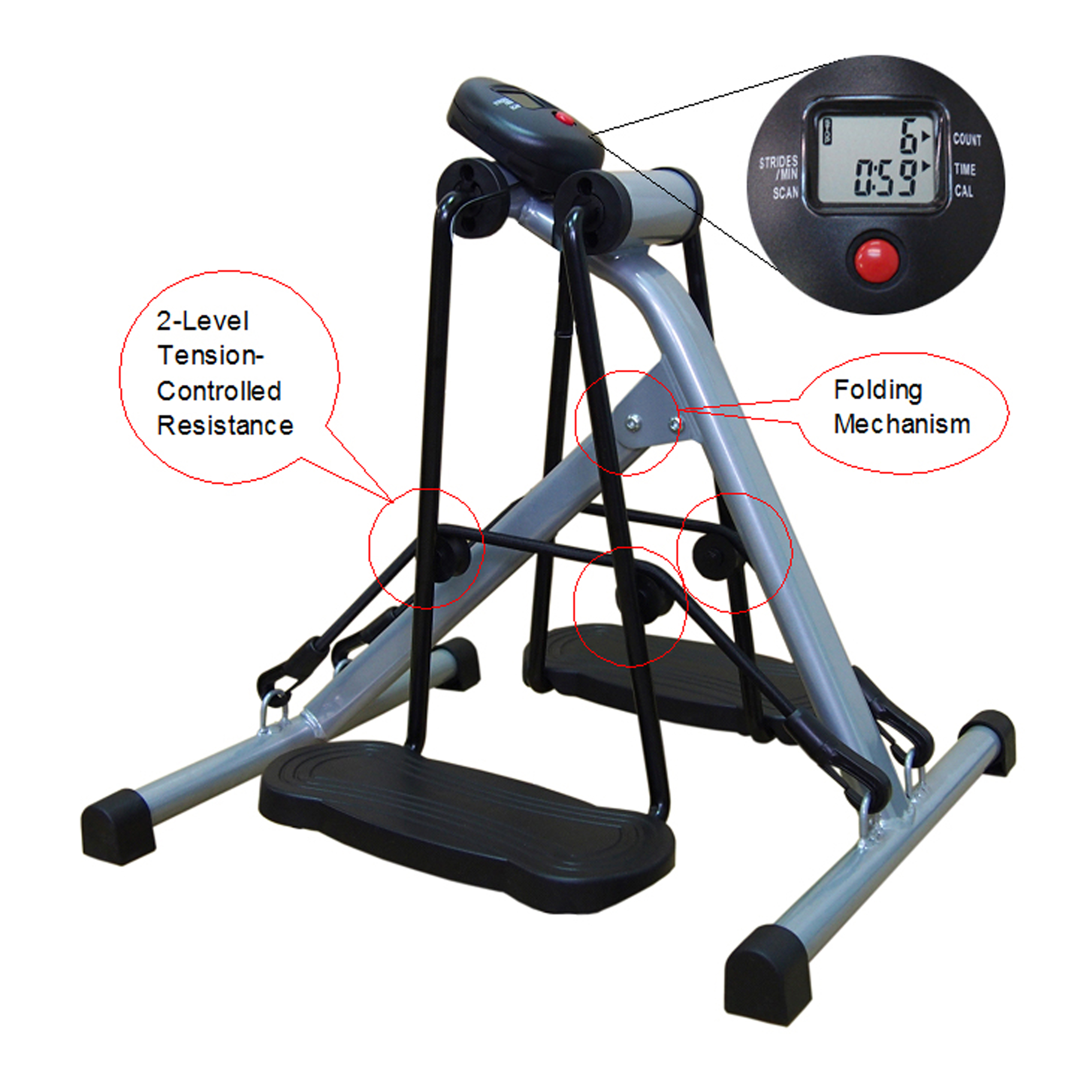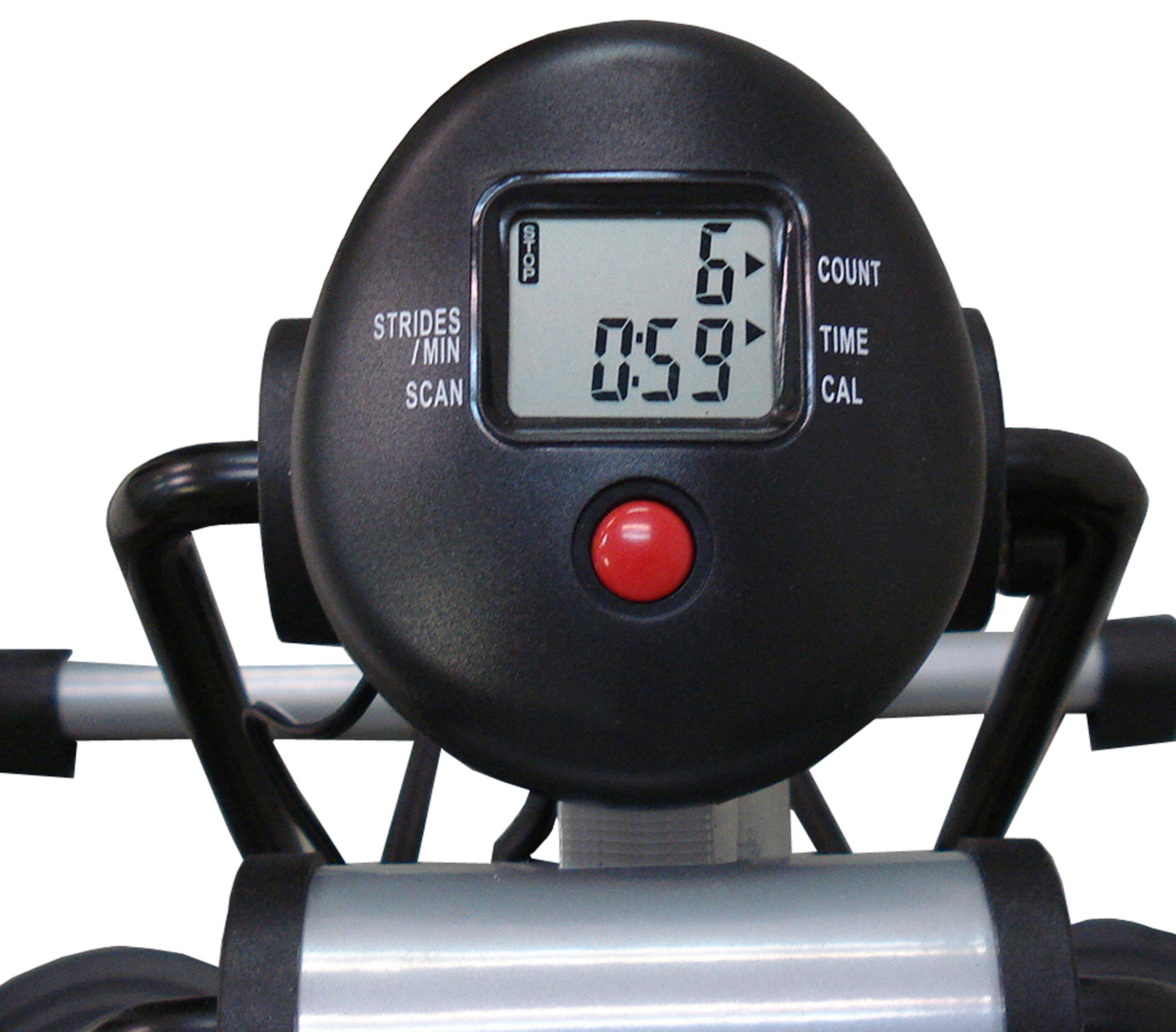 LCD Display Monitor: Tracks time, count, strides per minute, and calories.